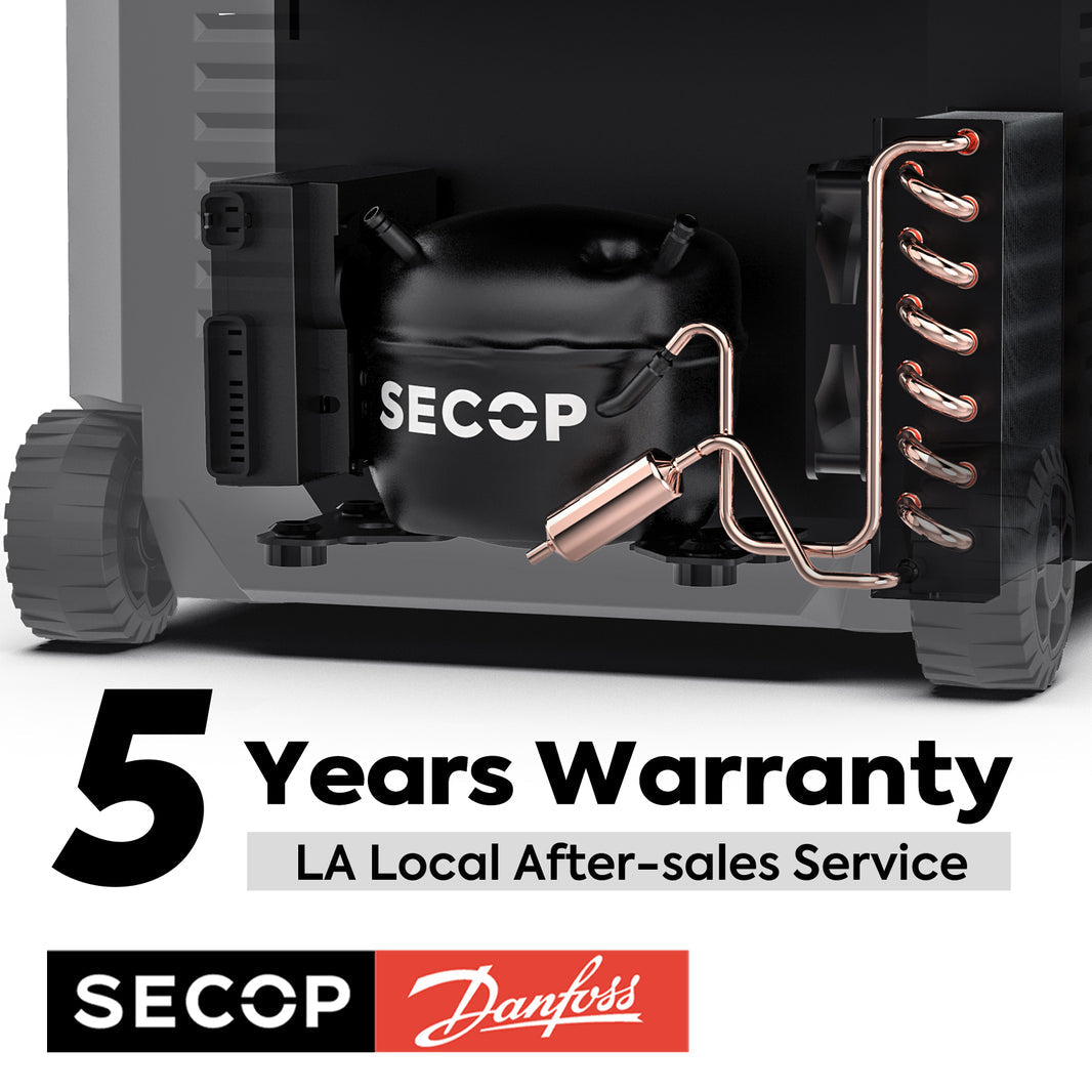 Our JP50 Prod easily transitions between single and dual zones with a broad -4°F to 68°F cooling range. Powered by a reliable SECOP (Danfoss) compressor (5-year warranty on compressor, 1 year for other parts), it features Bluetooth App Control for convenient temperature management on the go. Two handles, sturdy wheels, and a 40° tilt anti-vibration function ensure stable movement, while the reversible lid opens from the left, right, or detaches entirely for quick access. An optional UV lamp automatically sterilizes the interior after 30 minutes of corded use. Measuring 28.5" × 13.8" × 21" and weighing 44 lbs, the JP50 Pro is your perfect partner for hassle-free refrigeration or freezing—anytime, anywhere.